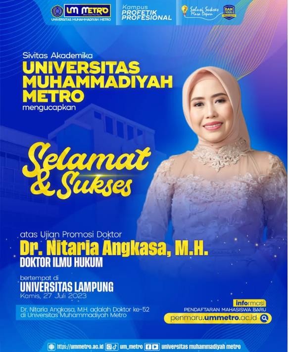 Universitas Muhammadiyah Metro kembali menorehkan prestasi akademik dengan lahirnya doktor baru di bidang ilmu hukum. Pada Kamis, 27 Juli 2023, telah dilangsungkan ujian terbuka promosi doktor bagi Ibu Dr. Nitaria Angkasa, M.H. yang bertempat di Universitas Lampung. Dalam sidang tersebut, beliau secara resmi dikukuhkan sebagai doktor ke-52 yang dihasilkan oleh Universitas Muhammadiyah Metro.