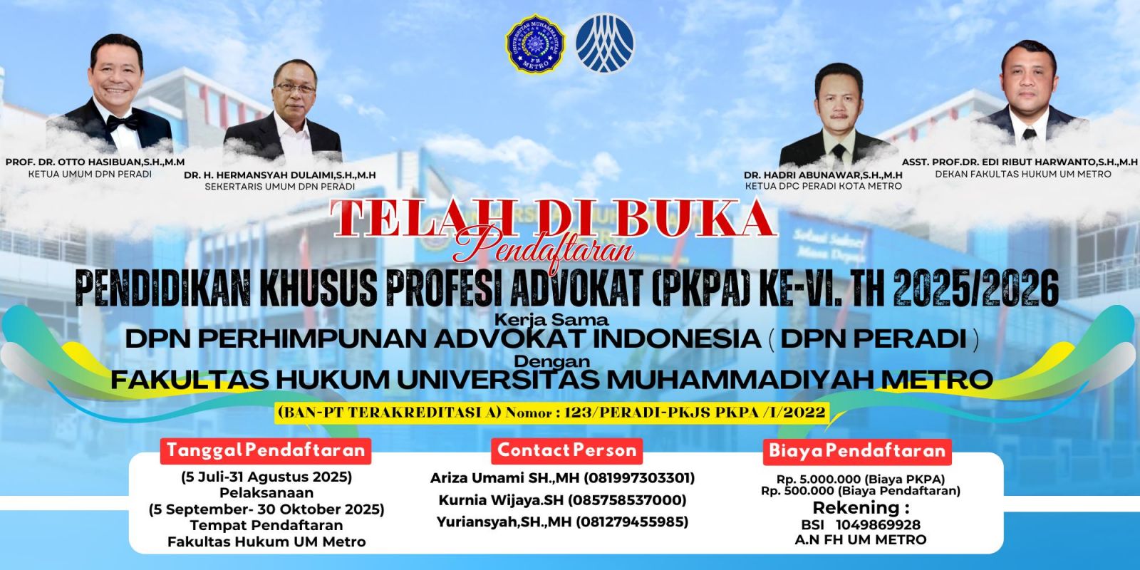 Fakultas Hukum UM Metro mengajak seluruh lulusan sarjana hukum yang ingin meniti karier sebagai advokat untuk segera mendaftar dan mengikuti program PKPA ini sebagai langkah awal menuju profesionalisme di bidang hukum.