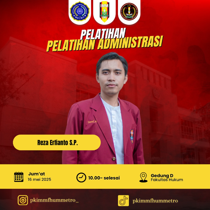 Metro, 16 Mei 2025 – Dalam upaya meningkatkan kapasitas dan kualitas pengelolaan organisasi, Pimpinan Komisariat Ikatan Mahasiswa Muhammadiyah Fakultas Hukum Universitas Muhammadiyah Metro (PK IMM FH UM Metro) mengadakan Pelatihan Administrasi pada Jumat, 16 Mei 2025, bertempat di Gedung D Fakultas Hukum.