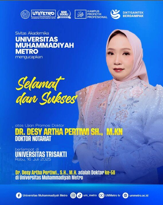 Kabar membanggakan datang dari sivitas akademika Universitas Muhammadiyah Metro. Salah satu dosen terbaiknya, Dr. Desy Artha Pertiwi, S.H., M.Kn., berhasil meraih gelar Doktor dalam bidang Ilmu Kenotariatan setelah melewati proses Ujian Terbuka Promosi Doktor yang dilaksanakan pada Rabu, 16 Juli 2025 di Universitas Trisakti, Jakarta.